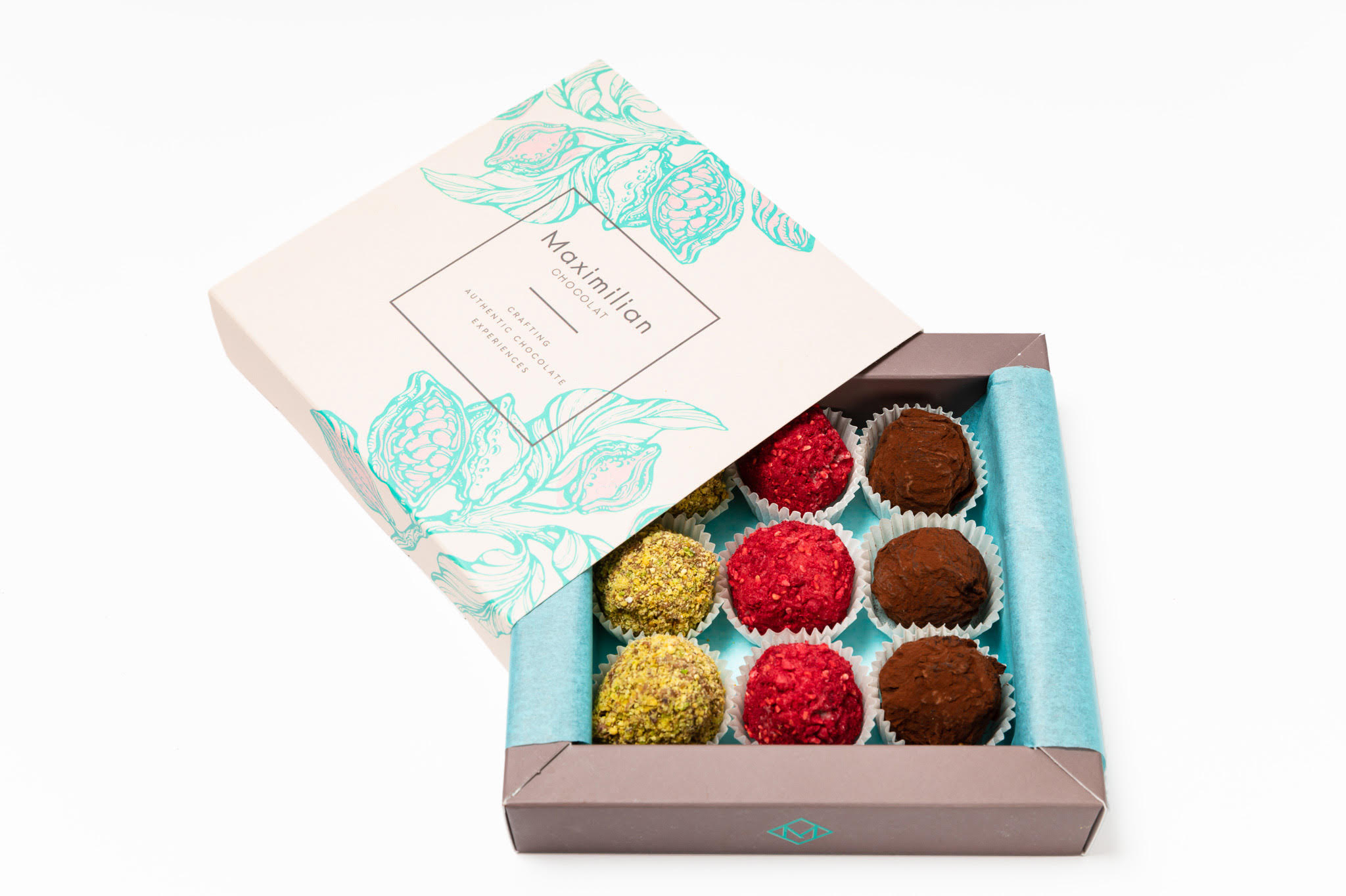 Cutie cu 9 trufe asortate cu gusturi pe alese: amaretto, cacao, fistic, zmeură, portocale, migdale, fructul pasiunii și cocos.