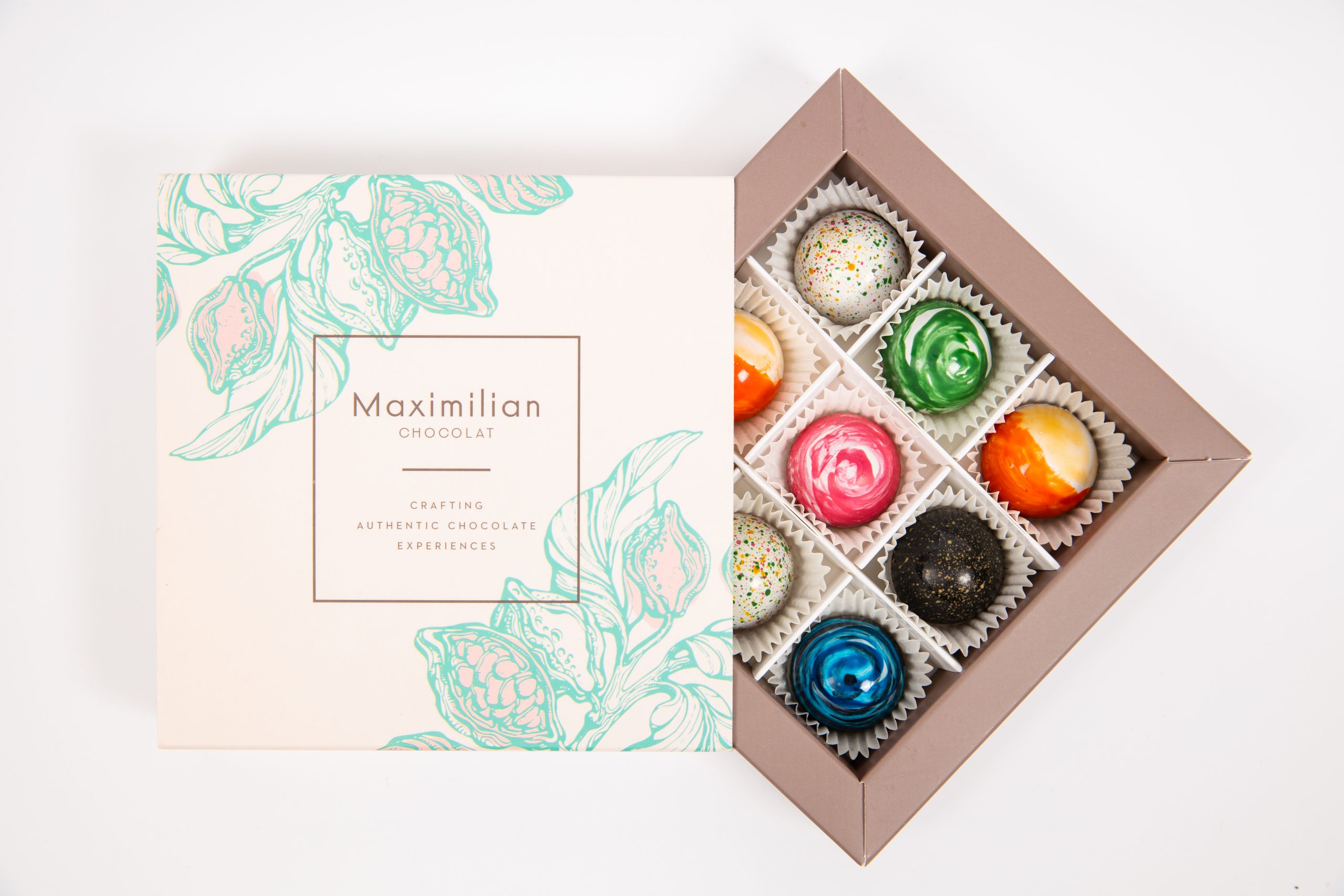 Box of 9 assorted pralines with flavors such as coffee, berries, salted caramel, milk chocolate, lime, hazelnuts, white tea, and peony. Our pralines offer authentic experiences for all five senses,